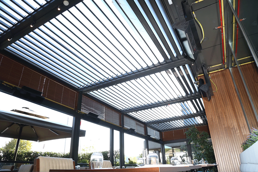 Rolling Roof, cafe, restoran, otel terasları ve villa bahçeleri için ideal bir çözümdür. Geniş açıklıkları tek parça halinde kapatabilme özelliği ile mimari sınırları zorlar. Özel tasarım imkanı ile her mekana uygun boyut ve renk seçenekleri sunuyoruz.